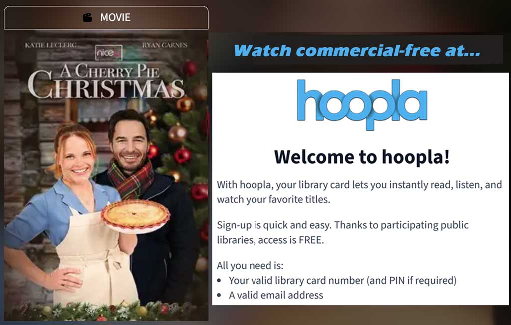 A Cherry Pie Christmas is available to stream for free through hoopla, a digital service offered by many public libraries. There are no ads, no rental fees, and no subscriptions. It is also available on free, ad‑supported streaming platforms including TubiTV, RokuTV, Pluto TV, Vizio, XumoTV, and on Amazon’s “Always Christmas” channel.
